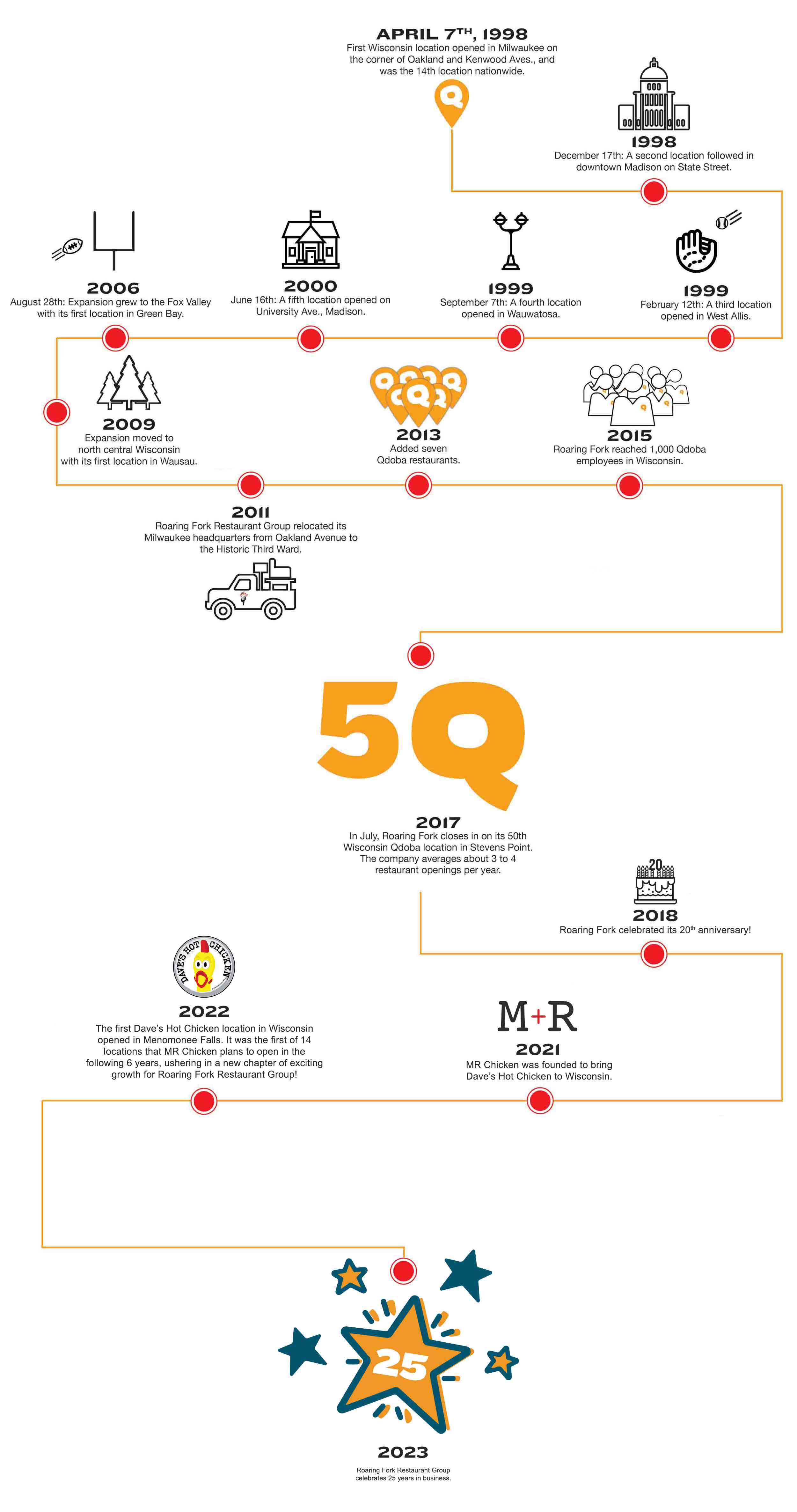 Roaring Fork Restaurant Group is a locally owned and operated Qdoba Mexican Eats franchise with a strong presence in WI, IL, and IA. In 2023 the company celebrated 25 years in business. Roaring Fork currently operates 62 QDOBA restaurants within our territory.